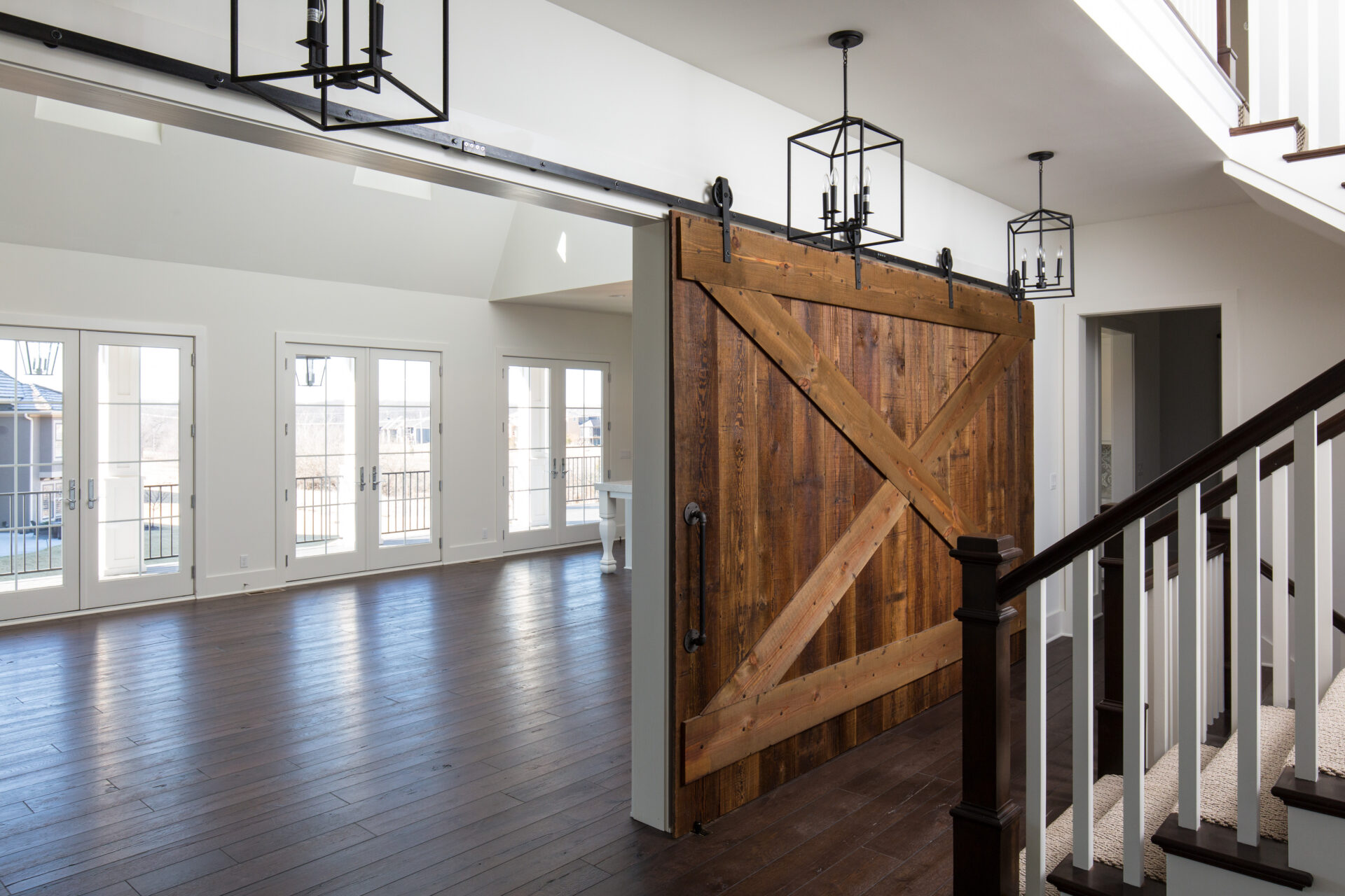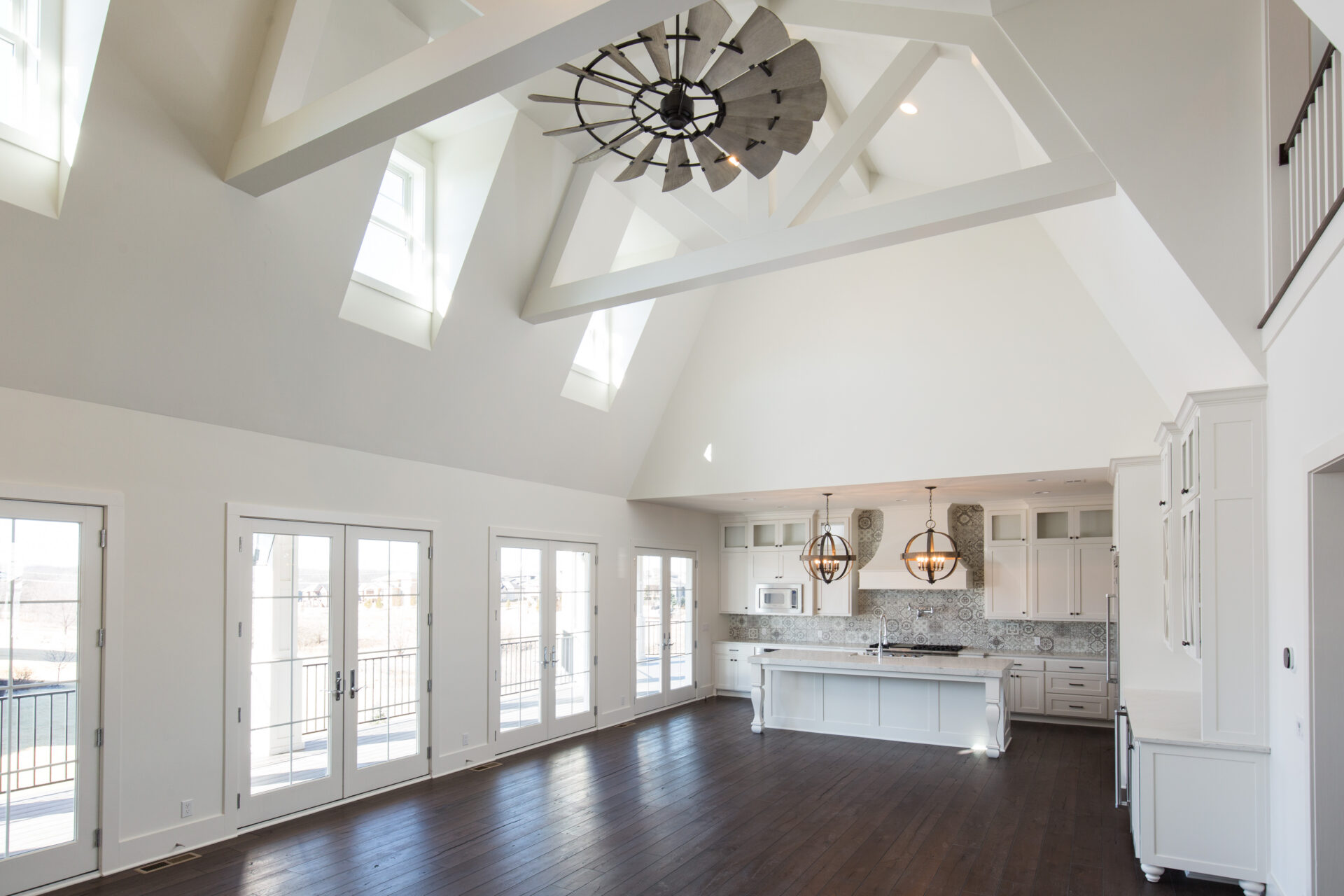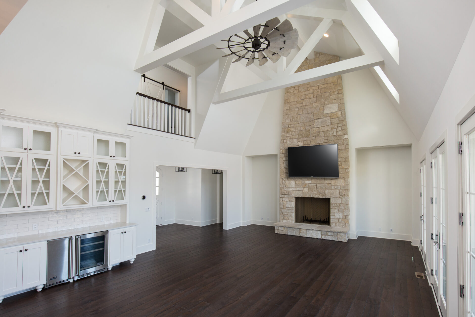 Vaulted ceilings, exposed beams, and expansive windows fill the home with natural light, while warm hardwood floors and custom details bring comfort and character throughout. The Grand Landing Residence blends timeless craftsmanship with open, inviting living spaces designed for everyday life.
